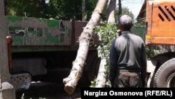 В Бишкеке сегодня, 2 июня, на улице Токтоналиева (бывшая Душанбинская) начали вырубать деревья в рамках проекта расширения дороги. Местные жители и гражданские активисты выступили против действий муниципальных структур.