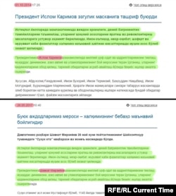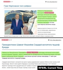 Между текстами выше – почти три года разницы. Первая статья – о визите Ислама Каримова в Ферганскую область и о "последовательном развитии экономики" региона. Во второй описывается приезд Шавката Мирзиёева в Сырдарью и о "стабильных шагах развития экономики" в этой области.