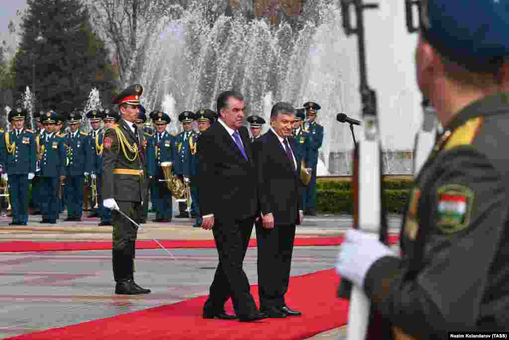 В международном аэропорту города Душанбе узбекского президента встретили президент Таджикистана Эмомали Рахмон и другие официальные лица, передает Таджикская служба РСЕ/РС.