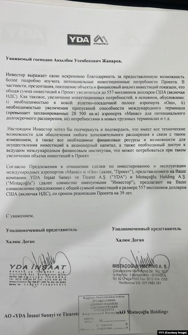 Между тем «Азаттык» получил в свое распоряжение проект меморандума между правительством КР и турецкой компанией YDA INŞAAT по передаче двух аэропортов под внешнее управление.